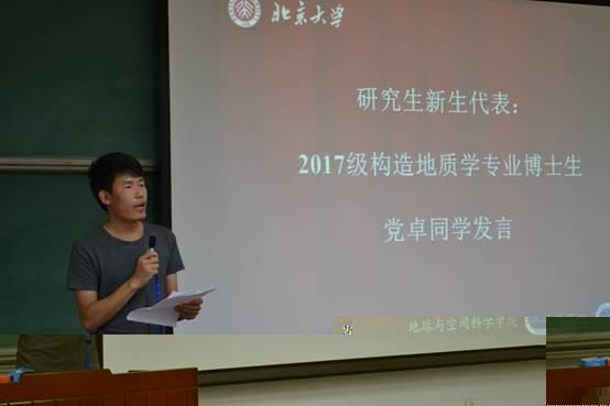 研究生代表黨卓、本科生代表陳麒安依次發言。黨卓同學首先表達了對學院迎新工作的感謝,随後以“夢想、目标、堅持”為線索闡述了自己對求學生活的感悟與期待,最後他祝願大家都能在燕園度過一段美好時光。陳麒安同學則結合自己的兩段經曆,表達了自己作為本科生新生面對全新生活的勇氣與信念,以及他對于地空人責任的理解。在校生代表于曦彤、張馳分别向本科學弟學妹們與研究生新同學表示祝賀與歡迎,并講述了自己在大學生活中的逐漸成長與在地空大家庭感受到的溫暖,分享了自己對地空學院與北大的認識,最後祝願大家在地空學院的生活充實飽滿,并在将來能夠為地空人的身份而驕傲。