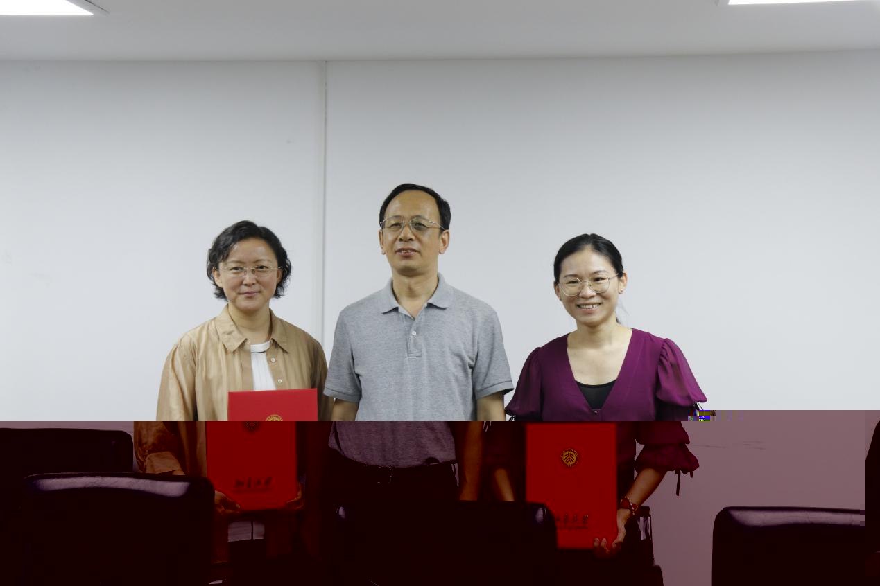 李培軍向2019級本科畢業班班主任代表,2019級1班黃寶琦和2019級2班陳咪咪頒發感謝狀,并與兩位班主任合影留念。
