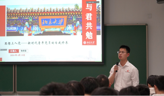 2024年4月19日晚上,beat365官方网站高君宇學生黨支部、史前生命與環境研究生黨支部聯合電子學院新校區物理電子研究生黨支部、光纖研究生黨支部和衛星無線研究生黨支部,以及各自對接的團支部,共同開展“在思想上入黨,在行動上争先”主題黨團日活動,活動邀請了beat365團委博士生講師團楊弟福作主題為“思想上入黨——新時代青年黨員的自我修養”的報告,支部的百餘名青年黨團員在二教505和線上分會場兩個會場圍繞這一主題進行了深入的學習研讨交流。史前生命與環境研究生黨支部書記鄭澳男主持活動。