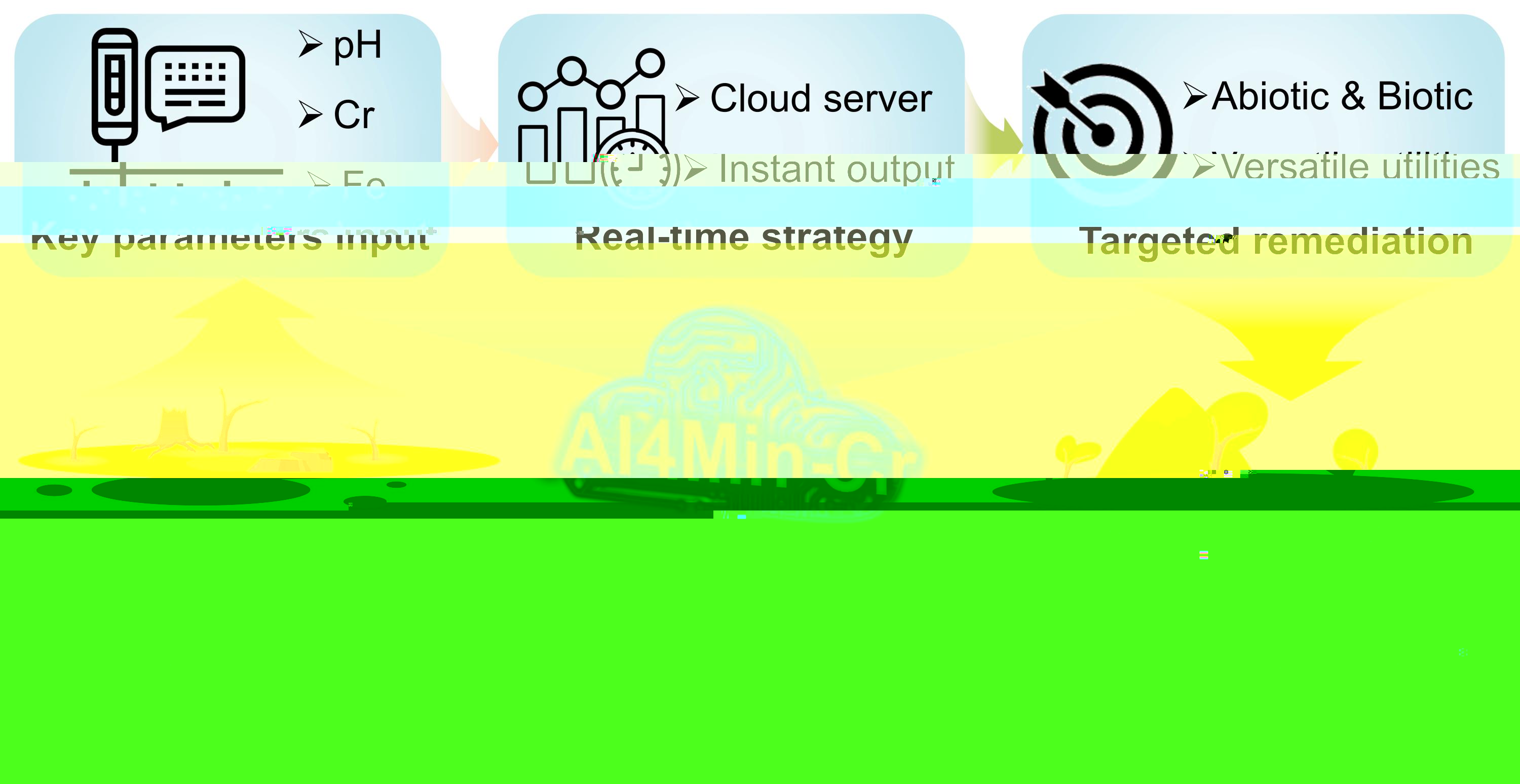 在當前AI時代背景下,團隊積極倡導“數據驅動科學發現與開放共享”的理念,構建了包含近萬組來自計算和實驗數據的鉻鐵礦生成反應Gibbs自由能數據集,開發了在連續變量條件下鉻鐵礦沉澱的理論模型,并将其轉化為AI4Min-Cr開源數據工具(http://cr.ai4mineral.com)。該工具可根據用戶輸入的pH值以及不同化學形态的Fe、Cr濃度等關鍵參數,通過動态建模生成定制化的鉻污染修複方案。AI4Min-Cr是國際上首個将環境礦物學與礦物信息學相結合并面向環保應用的智能工具,體現了鉻元素“從鉻鐵礦中來,再回到鉻鐵礦中去”的自然循環理念(圖2),為鉻污染的靶向治理提供了高效率、低成本的礦物學新策略。